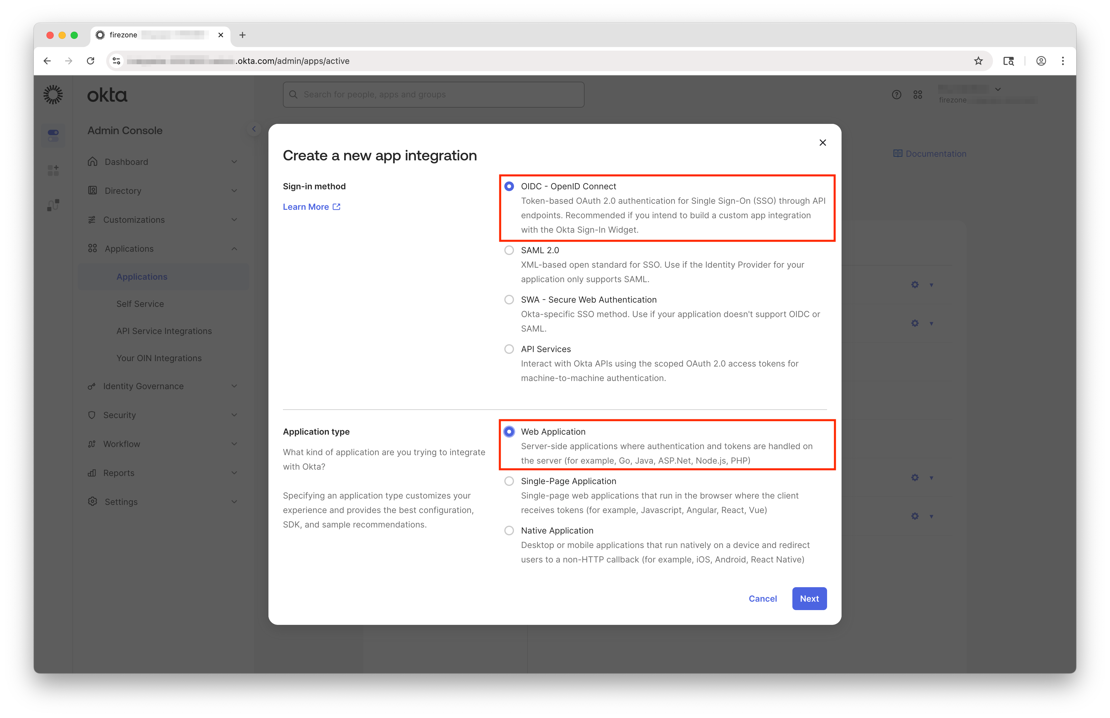 Before enabling Okta authentication in Firezone, you'll need to create an OIDC application in your Okta admin portal.